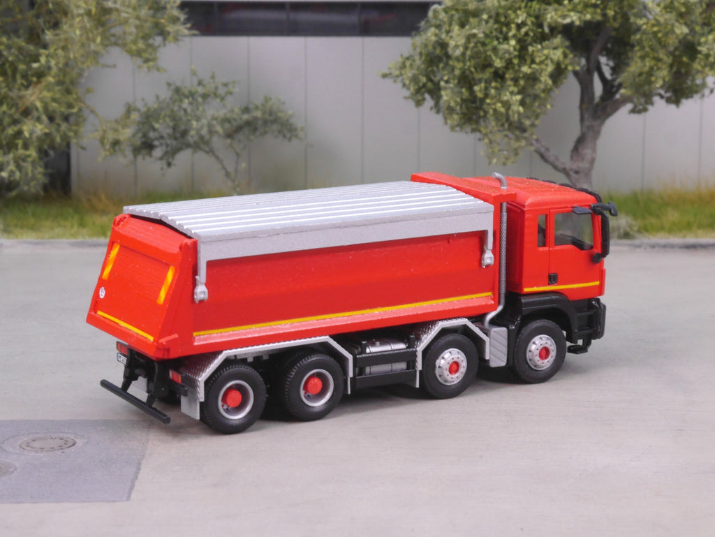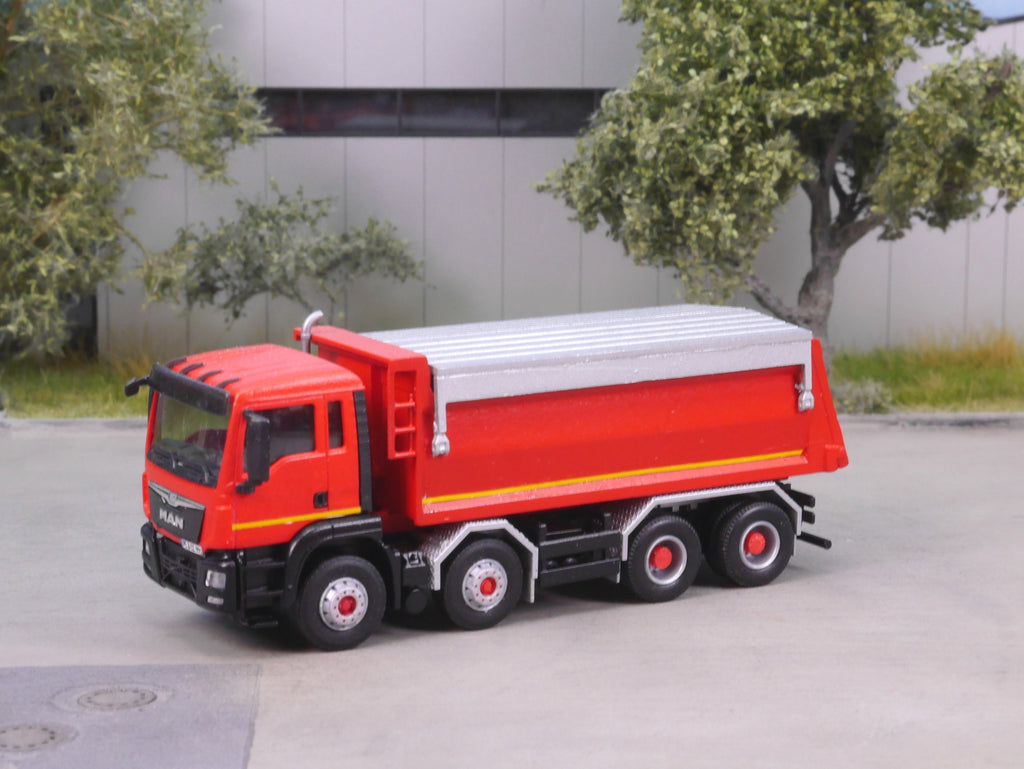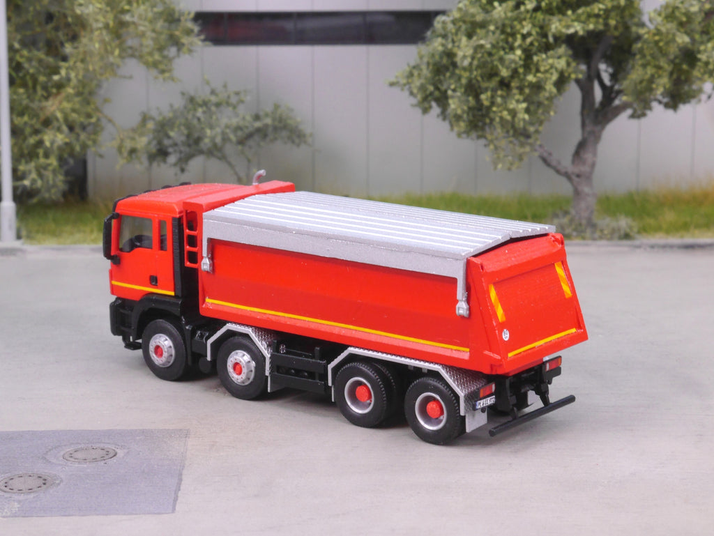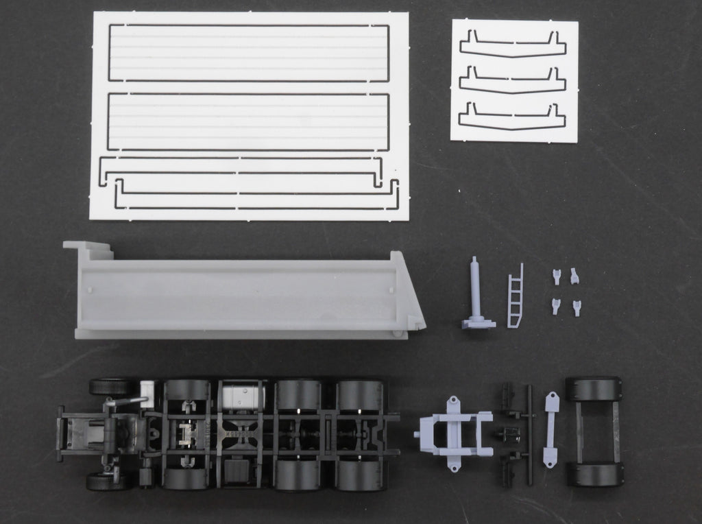 Bausatz enthält ein 4achs Chassis und einen unbeweglichen Kippaufbau inkl. Verdeck.